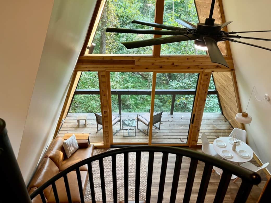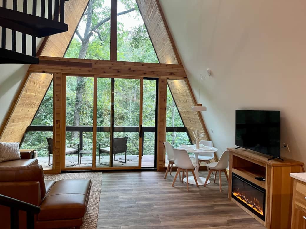 Near the heart of NWA, the Black Walnut Bungalow is a 700 square-foot A-frame cabin blending minimalist design with cozy comfort. Inside, guest will find themselves in an open concept living area featuring 16 foot ceilings and floor to ceiling windows. Outside, guest will find themselves surrounded by 70 acres of forest, while being only a short drive from boating on Beaver Lake, wandering Crystal, Bridges Museum, or at the head of an Ozark MTB trail.NOTE: 2 FREE RANGE GSP DOGS WILL BE ON SITE